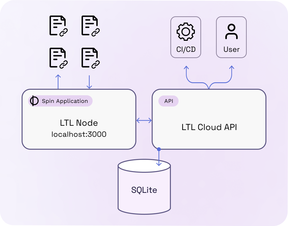 The diagram above illustrates how a user or automated CI/CD can interact with the LTL Cloud API via secure HTTP requests. All of the information is managed inside the SQLite database in Fermyon Cloud. The node software runs on its own, thanks to the Spin Cron Trigger.